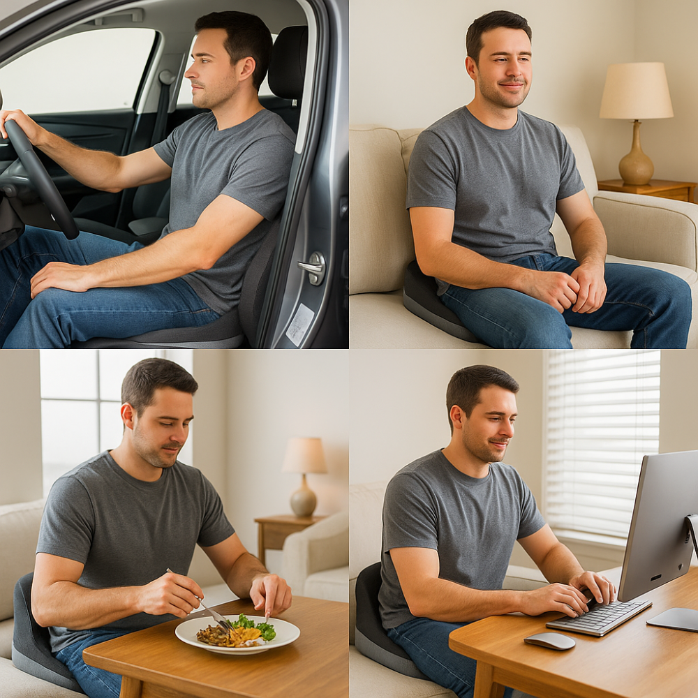 Coloque o Ergo-assento na cadeira ou no assento do carro e sente-se. A parte inferior antiderrapante garante uma fixação segura, enquanto a forma ergonómica proporciona um alívio imediato. Sem instalações complicadas - pronto a usar imediatamente!